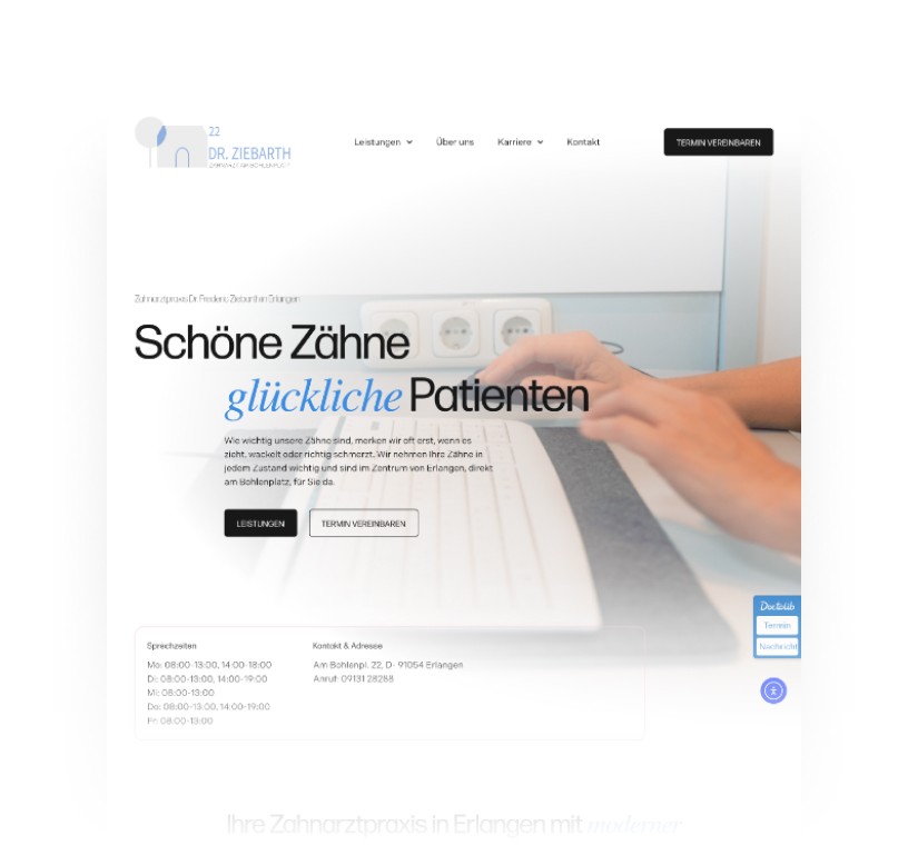 Moderne Zahnarztpraxis im Zentrum von Erlangen, die minimalinvasive Behandlungen, vollkeramische Versorgungen am selben Tag dank digitaler Zahnmedizin sowie einen einfühlsamen Service anbietet.